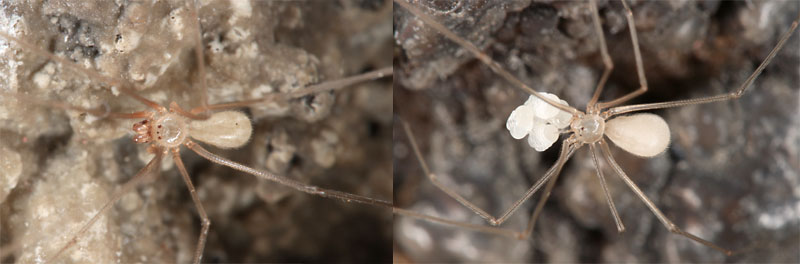 ![]() Above: Male and female with egg sac of Ossinissa justoi. The spiders live in total darkness but still have tiny eyes with pigment. |