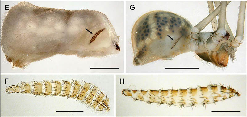 too. Here we show that Old World Micropholcus have a much wider distribution than suggested by the single previously known autochthonous species from the Arabian Peninsula. We describe new species from the Philippines and from Morocco, and document a suprising species richness on the Arabian Peninsula (Oman, Saudi Arabia). Particularly interesting is Saudi Arabia. Recent collecting in the Hijaz mountains along the Red Sea coast resulted in seven new species; previously, Saudi Arabia was among the very few nations worldwide without any published record of Pholcidae. ![]() Micropholcus on the Arabian Peninsula (left) and in Morocco (right). We also provide the first records of Acroceridae (fly) larvae in Pholcidae, extracted from book lungs. Acroceridae larvae seem to develop exclusively in true spiders, with an apparent preference for wandering and burrowing species. True web-building spiders such as Pholcidae are rarely attacked, which is probably due to the fact that the flies deosit their eggs on the substrate and the emerging larvae must actively search for their hosts. However, in some pholcids, the apex of the domed web is closely attached to the substrate, and this is the section of the web where the spider spends most of the day. We thus suggest that Micropholcus spiders are accessible to Acroceridae larvae because they rest in exactly the part of the web that is closely attached to the rock surface. ![]() Acroceridae larve in the booklungs of pholcid spiders (E, Micropholcus; G, Mesabolivar), and extracted larvae (F, G). |