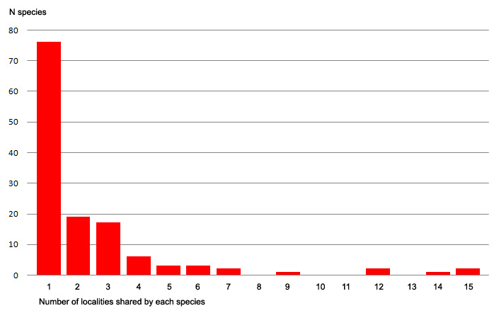 collected, 76 were found at only one locality, 112 (85%!) at only one
