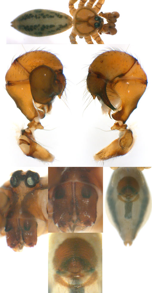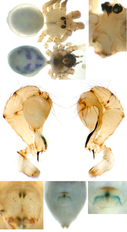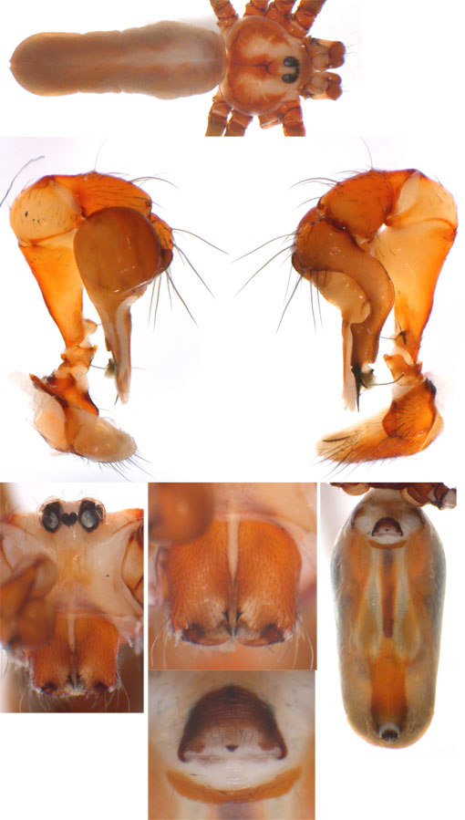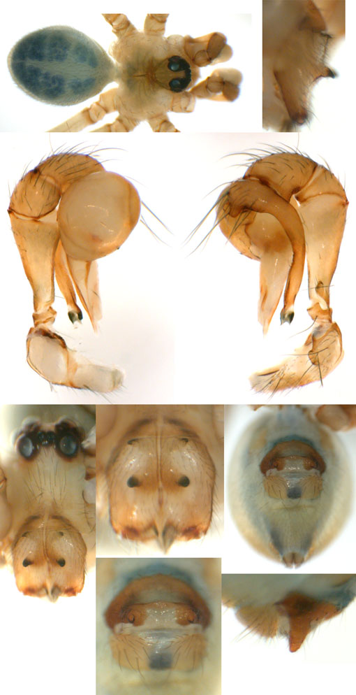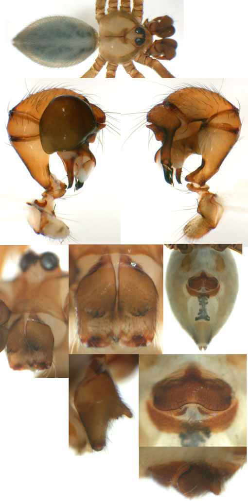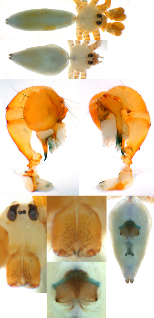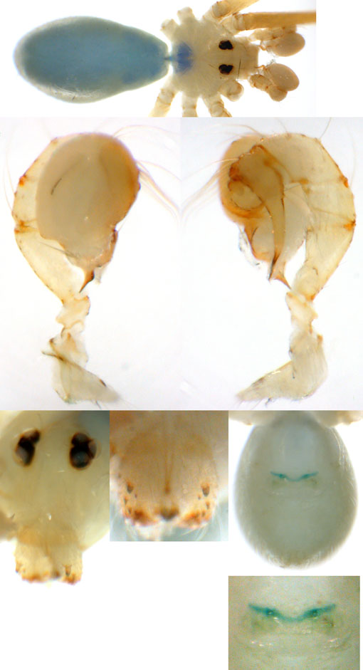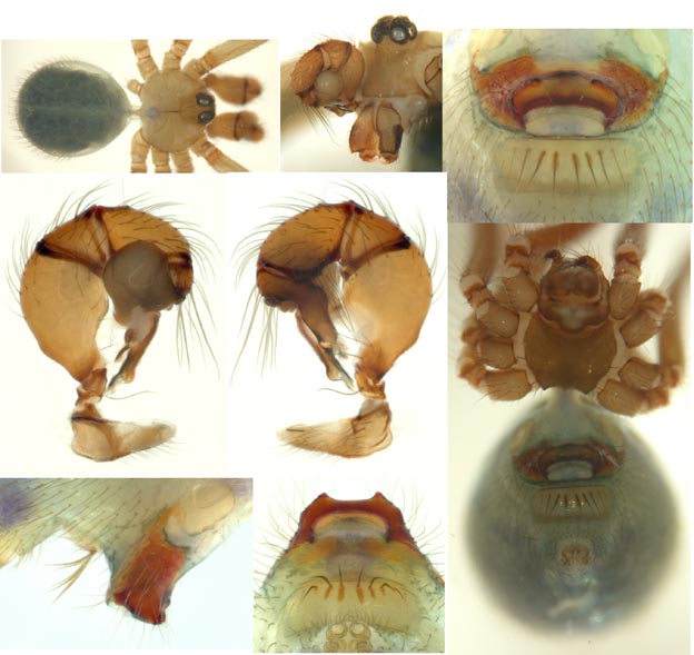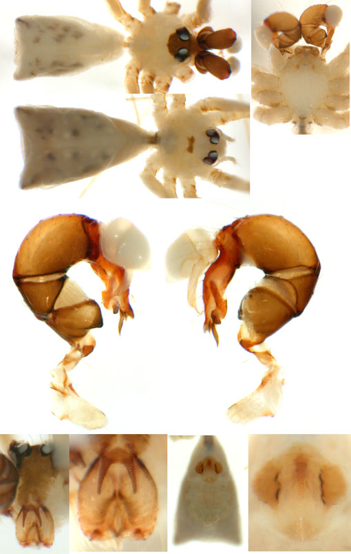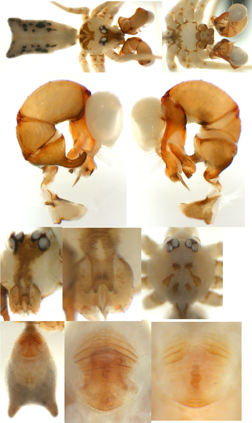 South (SC, PR, SP, RJ) Carapoia voltavelha (photos: Volta Velha, SC, Br10-9) [same species(?) form P.N. do Itajaí, SC, Br14-27] Carapoia genitalis (photos: Paranapiacaba, SP, Br03-33) Carapoia ubatuba (photos: Ubatuba, SP, types ZFMK) Carapoia macacu (photos: Guapiaçú, RJ, Br09-5) Carapoia divisa (photos: Santa Maria Madalena, RJ, Br10-14) Center (ES, BA) Carapoia una (photos: Res. Biol do Una, BA, Br11-83) Carapoia rheimsae (photos: Res. Biol do Una, BA, Br11-93) Carapoia brescoviti (photos: Res. Biol do Una, BA, Br11-85) Carapoia nairae (photos: Vargem Alta, ES, Br10-34) Carapoia capixaba (photos: Sooretama, ES, Br11-14) Carapoia gracilis (photos: Pau Brasil, BA, Br11-59) Carapoia zumbii (photos: Serra Bonita, BA, Br11-65) Carapoia dandarae (photos: Serra Bonita, BA, Br11-67) Carapoia n.sp. Br11-73 (photos: Serra Bonita, BA, Br11-73) Carapoia marceloi (photos: Reserva Michelin, BA, Br11-96) Carapoia carybei (photos: São João, BA, Br11-116) Carapoia jiboia (photos: Sta Terezinha, BA, Br15-3) Carapoia carvalhoi (photos: Sta Terezinha, BA, Br15-7) Carapoia maculata (photos: Morro de Pedra, BA, Br15-15/16) Carapoia exigua (photos: Morro de Pedra, BA, Br15-18) North (SE, AL, PE, PB, RN) Carapoia crasto (photos: Mata do Crasto, SE, Br15-19) Carapoia alagoas (photos: Usina Serra Grande, AL, Br15-72/73) Carapoia abdita (photos: nr. Bonito, PE, Br15-88) Carapoia saltinho (photos: Saltinho, PE, Br15-92) Carapoia septentrionalis (photos: Cafundó, PB, Br15-125) Carapoia djavani (photos: Pedra Talhada, AL, Br15-60) Carapoia agilis (photos: nr. Bonito, PE, Br15-79) Carapoia pulchra (photos: Pedra Talhada, AL, Br15-62/63) Carapoia suassunai (photos: Mata de Pipa, RN, Br15-145/146) Carapoia bispina (photos: nr. Bonito, PE, Br15-78) |