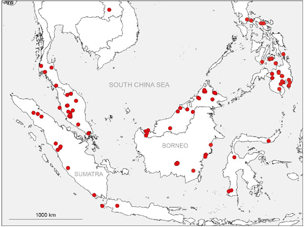 2011).![]() Male Calapnita from Loksado, South Kalimantan (photo BAH). The latest revision of the genus (Huber 2011) counted seven species, yet it was fairly obvious that some species would have to be split, pending further collecting and study. For example, specimens previously assigned to the type species C. vermiformis are here considered to represent seven species. The present revision is thus primarily a reevaluation of the species diversity of Calapnita, based on a much larger sample than previously available (almost 1300 adult specimens, most of which were collected during recent expeditions). It provides a more accurate picture of the alpha diversity and distribution of the genus, gives further data about the natural history of several species, presents an updated morphological phylogeny of the genus, and provides formal names for the upcoming next version of the molecular phylogeny of Pholcidae. ![]() Known distribution of Calapnita. |