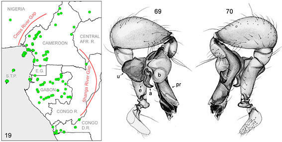 during expeditions to to these countries in 2009 and 2011 (see Cameroon; Gabon) Distribution and diversity patterns are compared with data on West and East Africa. While West Africa contains a similar set of genera it is significantly less diverse than Central Africa. East Africa is taxonomically more distinct. It has similar levels of diversity as Central Africa, but appears to be less undersampled. ![]() Biogeographically, the area considered is roughly limited by the Cross River Gap in the west and the Sangha River Gap in the east. The drawings show the male palps of a new Pholcus species from Gabon. |