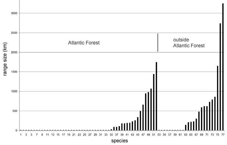 ![]() A comparison of distribution ranges between 52 Atlantic Forest species and 25 species from all other regions revealed significantly smaller ranges in Atlantic Forest species (mean 184 km, SD 382 km versus 541 km, SD 841 km; Independent Samples t-test, P=0.000). This is probably correlated with the large number of litter-dwelling species in the Atlantic Forest. The high number of distribution-limited litter-dwelling species in the Atlantic Forest also explains the high number of species currently known from a single locality. In the Atlantic Forest, this value is at 65% (34 of 52 species). Outside the Atlantic Forest, only 40% (10 of 25 species) are known from a single locality. The true difference may be even bigger, considering the apparently denser sampling in the Atlantic Forest as compared to the rest of South America. |