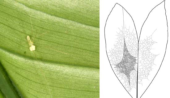 | Leaf-dwelling pholcids have evolved several times independently on different continents. They are pale greenish in life and are therefore often barely visible on the undersides of leaves where they rest during the day. Apart from that, very little is known about their biology. Here we give some preliminary data on the biology of two species of the New World genus Metagonia. Left photo: Metagonia delicata, photo courtesy M. Schmitt; right drawing: web of Metagonia osa on an Asplundia leaf. |
