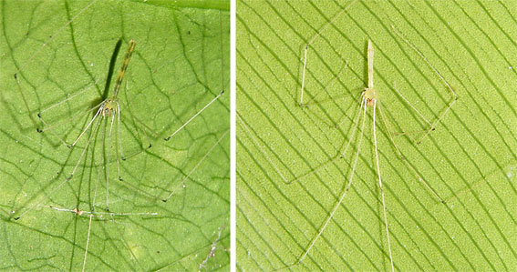 are leaf-dwelling pholcids with pale-greenish coloration and long and