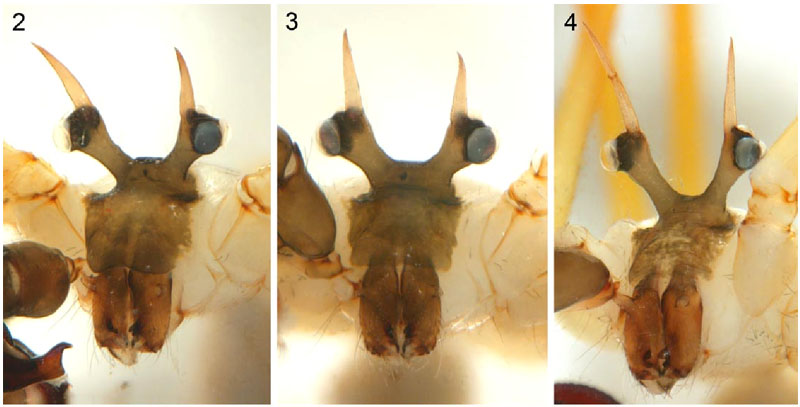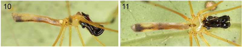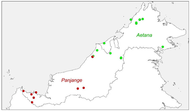 The Panjange nigrifrons group on Borneo includes beautiful spiders whose palps appear pitch-black in life specimens (above). They have been assigned to the SE-Asian genus Panjange from the very beginning (i.e. when the first species was described together with the genus in 1983). However, relationships are far from clear. ![]() Bornean representatives of Panjange (i.e., representatives of the Pa. nigrifrons group) are more similar to species currently placed in Pholcus from Sumatra, the Malay Peninsula, and Sri Lanka than to other species groups of Panjange in the Philippines (incl. the type species) and east of the Wallace Line (Huber 2011; Huber & Nuñeza 2015). For example, the pointed prejections from the eye stalks in some Bornean Panjange species (above) strongly remind of certain Pholcus species from Sumatra. ![]() One surprising finding of this study is that Panjange seems to be absent from Sabah (above). We sampled with the same methodology and diligence at six localities west of Niah (sea level to 930 m a.s.l.) as we did at nine localities east of Niah (sea level to 1650 m a.s.l.). Panjange was found at all six localities west of Niah (and in Niah), but in none of the nine localities east of Niah. Even more surprising, Aetana shows the exactly opposite distribution pattern in northern Borneo. We found various species of Aetana at eight of nine localities east of Niah (and in Niah), but in none of the six localities west of Niah (Huber et al. 2015). Obviously, large sampling gaps remain, and a meaningful interpretation will have to build on a much more intense sampling including Kalimantan. However, data on better studied organisms such as birds have also supported a biogeographical divide between Sabah and Sarawak despite continuous rainforest (Gawin et al. 2014, http://dx.doi.org/10.1525/bio.2011.61.1.10; Sheldon et al. 2015, http://dx.doi.org/10.1007/s10336-015-1188-3). These authors mainly suggest historical reasons for this pattern, such as early Pleistocene rainforest refugia in Sabah versus dry habitats in Sarawak (at that time part of central Sundaland). Whether the same explanations apply to spiders as to birds remains to be established. |