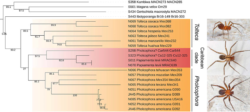 (Curaçao) and Caribbean ‘Pholcophora’.![]() In a previous study we suggested that the karyotype of Pholcophora americana (2n♂ = 29, X1X2Y) is close to the supposed ancestral karyotype of pholcid spiders (Ávila Herrera et al., 2021). First karyotype data for Tolteca (2n♂ = 13, X1X2Y and 15, X1X2Y, respectively) reveal a strong reduction of the number of chromosome pairs within the North American-Caribbean clade. In addition, we document considerable karyotype differentiation among congeners in Tolteca. This agrees with considerable CO1 divergence among Tolteca species but contrasts with very inconspicuous morphological divergence. Environmental niche analyses show that the widespread P. americana Banks, 1896 (western USA, SW Canada) occupies a very different niche than its Mexican congeners and other close relatives. Caribbean taxa also have a low niche overlap with ‘true’ Pholcophora and Tolteca, supporting the idea that Caribbean ‘Pholcophora’ are taxonomically misplaced. ![]() |