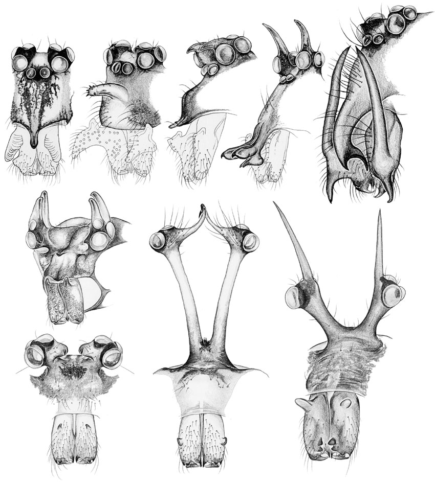 other spiders this is neither spectacular nor unusual. Thus, it was no surprise when a recent study on sexual dimorphisms in arachnids (McLean et al. 2018, http://dx.doi.org/10.7717/peerj.5751) turned out to be heavily biased towards size dimorphism. This is what a Google search will tell you: sexual dimorphism in spiders is mainly about size. Taxonomists of course know that this is wrong, but the dimorphisms they describe are 'hidden' in species descriptions and taxonomic papers and not easily filtered by a search algorithm. This motivated me to make a comprehensive list of sexual dimorphisms in Pholcidae. Some are quite spectacular, like the male 'head' modifications shown below, but this was no criterion. I tried to list all published dimorphisms, and to map them on the phylogeny of the family to get a rough estimate about how many times sexual dimorphisms have evolved in Pholcidae. Sexual dimorphisms occur in almost any part of the body: the prosoma (ocular area, clypeus, sternum), abdomen, chelicerae, legs, sensory organs (setae, tarsal organs), and in coloration. Character mapping shows that sexual dimorphisms have originated more than 120 times independently. First conclusion: it's time to look beyond size. Second conclusion: dear fellow taxonomists, please revise dimorphisms in 'your' taxon! ![]() |
